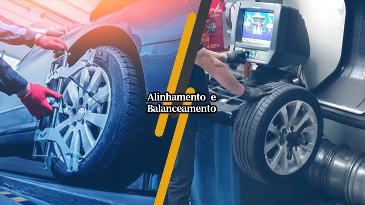 Balanceamento de pneus e montagem de rodas. O alinhamento, por outro lado, ajusta os ângulos das rodas e as mantém niveladas com o solo e paralelas entre si.